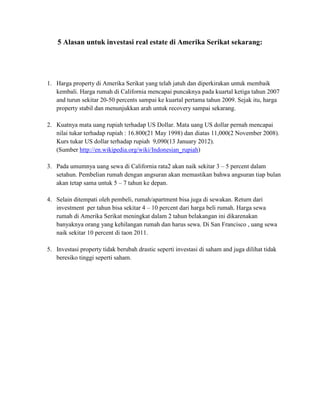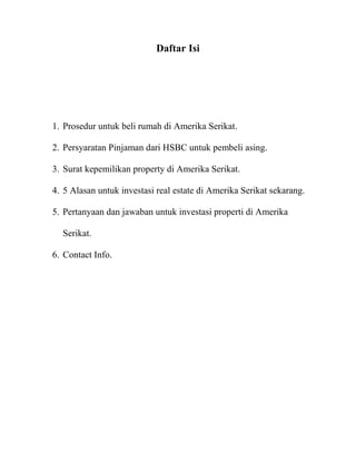 Dokumen ini menjelaskan prosedur pembelian rumah di Amerika Serikat, termasuk persyaratan pinjaman dari HSBC untuk pembeli asing dan langkah-langkah yang harus diikuti dalam proses pembelian. Ada penjelasan tentang syarat visa dan dokumen yang dibutuhkan, serta rincian mengenai pendanaan dan biaya yang terlibat. Selain itu, dokumen ini juga memberikan informasi tentang bagaimana investasi properti di Amerika Serikat dapat menguntungkan saat ini.