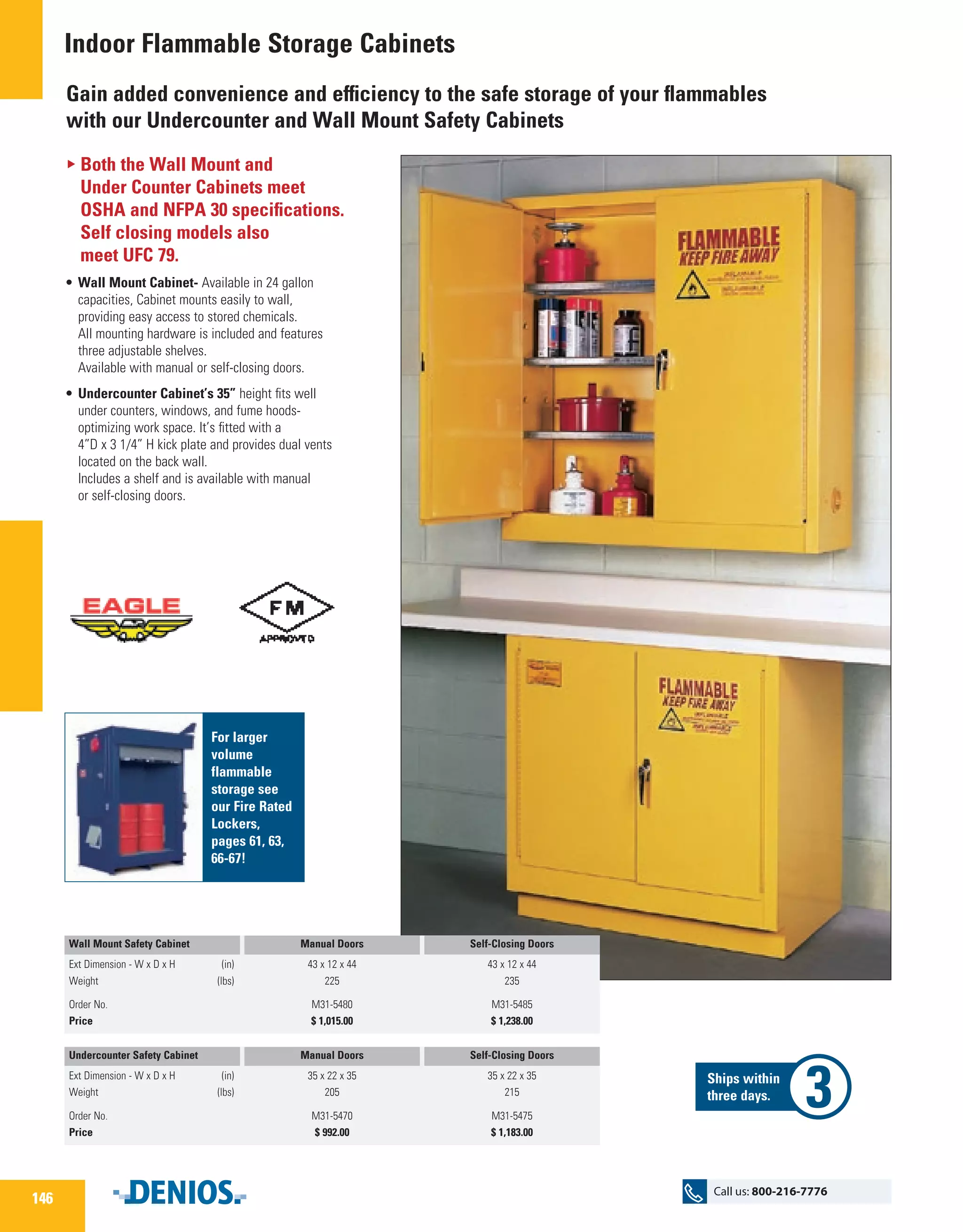 The document details indoor flammable storage cabinets that ensure safe storage of flammable materials, compliant with OSHA and NFPA specifications. It describes various models including wall-mounted and undercounter cabinets, emphasizing features like self-closing doors, adjustable shelves, and double-walled construction. Pricing and specifications are provided for multiple cabinet sizes and types, alongside contact information for ordering.