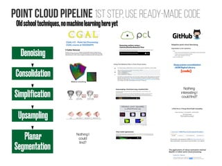 This document discusses using deep learning techniques for semantic segmentation of indoor point clouds. It provides an overview of initial ideas for using deep learning models trained on 3D CAD models to classify and label points in an indoor point cloud. It also discusses pre-processing the point cloud through techniques like denoising, upsampling, and finding planar surfaces to simplify the input before semantic segmentation. The order of semantic segmentation and 3D reconstruction is noted as something that could potentially be swapped.