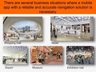 The document discusses the need for reliable indoor positioning solutions in various business environments like shopping malls and airports. It compares different technologies, noting that Indoor Atlas utilizes a building's natural magnetic field for accurate indoor navigation without additional devices. An airport app combining Indoor Atlas with iBeacons is being developed by Arworks to enhance user experience.