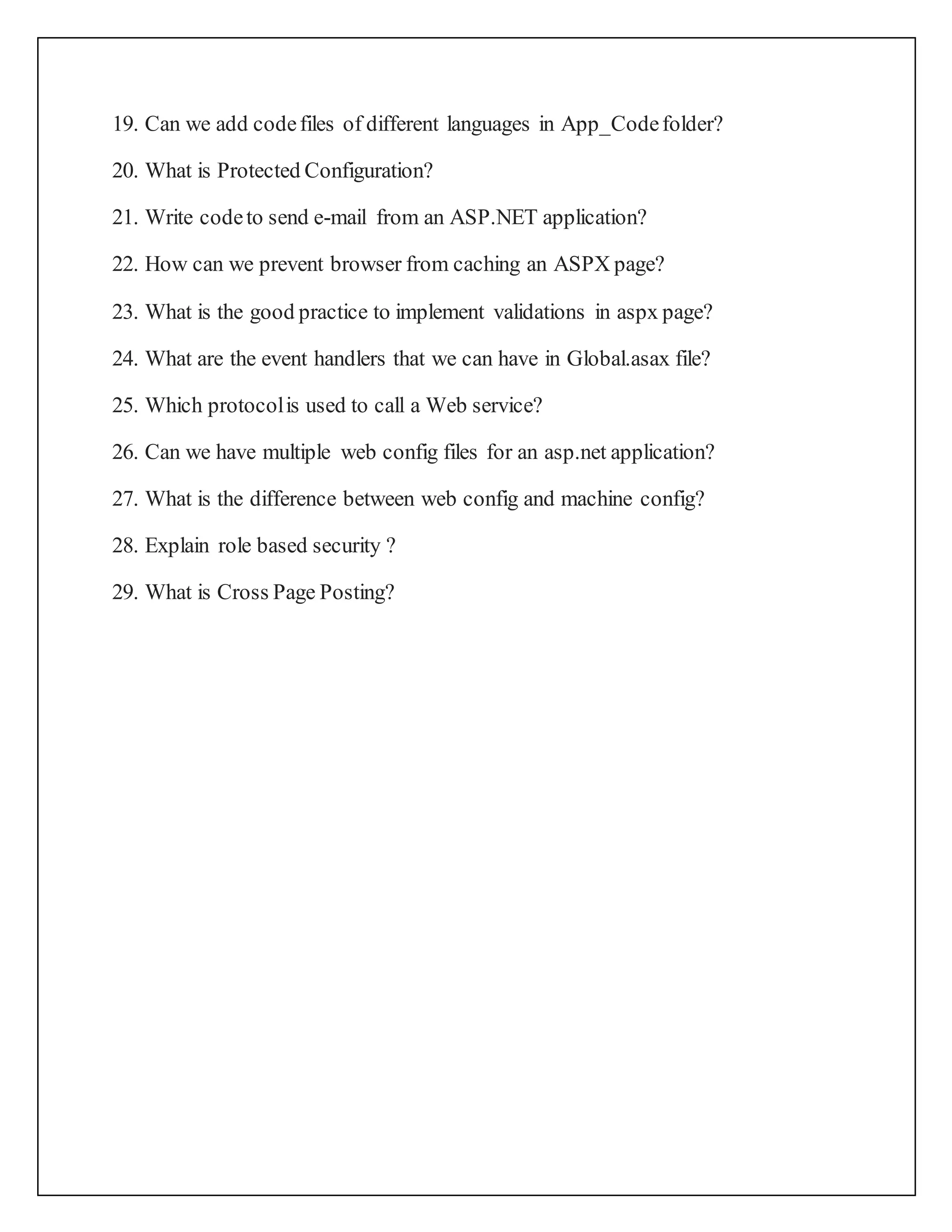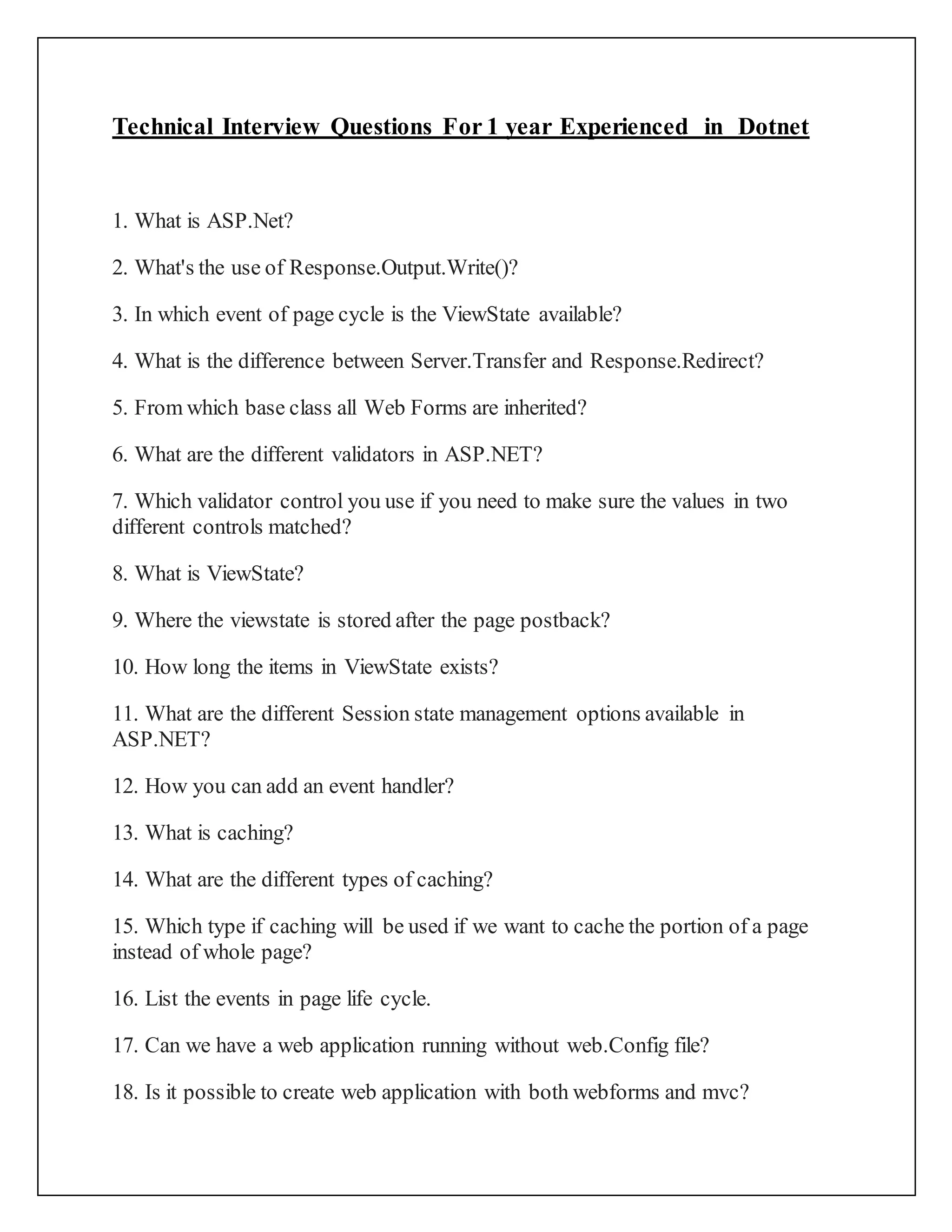 This document contains 29 technical interview questions for someone with 1 year of experience in .NET, covering topics such as ASP.NET, page lifecycles, viewstate, session state, caching, validation, web services, configuration files, and security. Some of the questions ask about specific ASP.NET controls and properties, differences between page redirection and server-side transfers, viewstate storage location, caching types for partial page content, and adding event handlers in code files and globally.