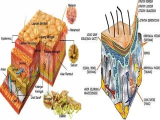 Dokumen ini membahas tentang indera peraba kulit yang memiliki reseptor untuk berbagai rangsangan seperti sentuhan dan panas. Struktur kulit terdiri dari lapisan epidermis dan dermis yang memiliki fungsi dan kelainan seperti alergi, panu, dan kanker kulit. Selain itu, kulit berfungsi sebagai penyimpan lemak, tempat pembentukan vitamin D, serta pelindung dari benturan.