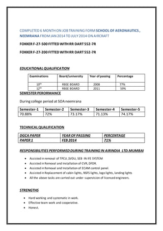 This curriculum vitae is for Indrajeet Singh Rathore, who has over 3 years of experience in aviation maintenance. He is currently an apprentice at Air India where he assists with tasks like removing equipment from aircraft and installing replacement parts under supervision. His education includes a 3-year aircraft maintenance engineering course and he holds a technical qualification from the DGCA. His objective is to work for a reputable aviation organization where he can develop his potential and contribute to the growth of his career.