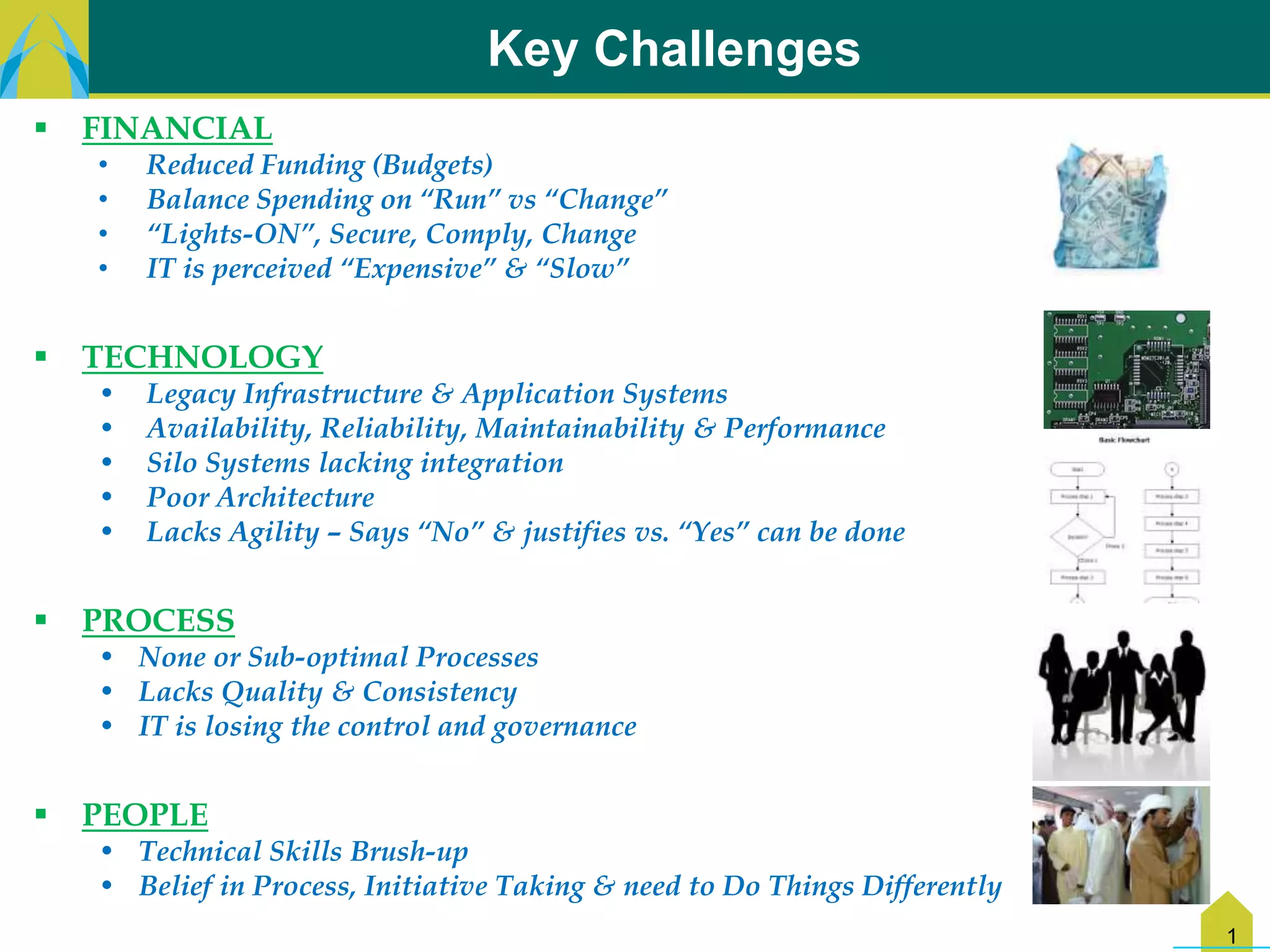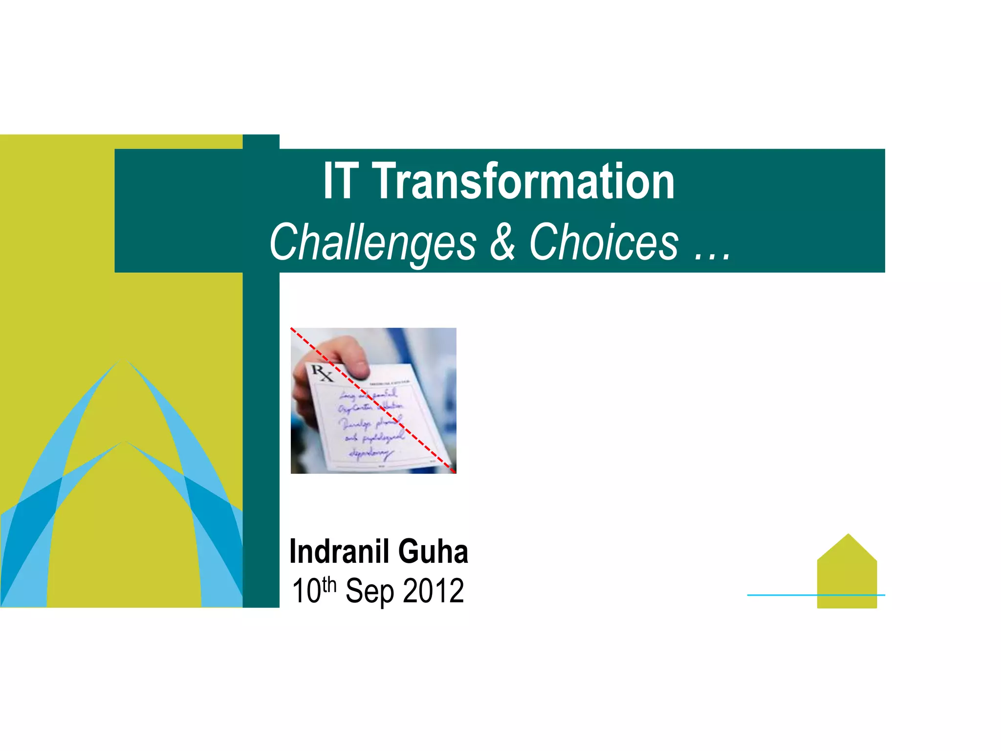 The document discusses key challenges in IT transformation including financial constraints, legacy infrastructure issues, lack of processes, and need for technical skills updates. It identifies quick wins like implementing change control and architectural blueprints. New opportunities include business-IT collaboration and proliferation of technologies. The way forward involves reducing distractions, implementing quick wins, and developing strategic and tactical plans covering people, processes, and technology. This would help build an agile IT environment leveraging approaches like cloud, outsourcing, and maturity models.