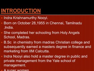 Indra Nooyi is a strategic leader who currently serves as CEO of PepsiCo. She was born in 1955 in Chennai, India and holds multiple master's degrees including an MBA from IIM Calcutta and an MPA from Yale University. Nooyi has had a successful career rising through the ranks at companies like PepsiCo, Boston Consulting Group, and Motorola. As CEO of PepsiCo, she has made strategic decisions like acquisitions and creating new distribution systems to reduce costs. Nooyi is recognized as one of the most powerful businesswomen and has received several prestigious awards for her achievements and leadership.