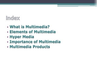 The document provides a comprehensive introduction to multimedia, defining it as a combination of text, graphics, sound, animation, and video delivered interactively. It covers various aspects such as types of media, history, input/output devices, and applications in fields like business, education, and entertainment. Additionally, it discusses multimedia products, their characteristics, and the differences between linear and non-linear presentations.