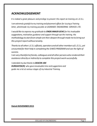 This document provides details of a four month industrial training completed by Abdulrazak Yusuf at Legrande Engineering Services Limited from August to November 2015. It includes an acknowledgement, index, introduction about the training, student profile, project information including the site location and layout. The document then describes the various methodologies used in the construction work, including site clearance, excavation, blinding, foundation construction and other steps. It provides information about the company, equipment used, safety measures, quality control, drawings and the overall benefits gained from the training experience.