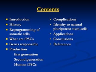 The document discusses induced pluripotent stem cells (iPSCs), which are derived from adult somatic cells that are reprogrammed by introducing genes associated with pluripotency. iPSCs were first generated in 2006 and resemble embryonic stem cells. They can be produced from a person's own cells and have potential applications in disease modeling, drug development, and regenerative medicine without ethical issues associated with embryonic stem cells.