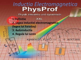 Inducția electromagnetică este fenomenul de generare a unei tensiuni electromotoare într-un circuit traversat de un flux magnetic variabil, demonstrat experimental de M. Faraday în 1831. Legea inductiei electromagnetice (Legea lui Faraday) stipulează că tensiunea electromotoare indusă într-un circuit este proporțională cu viteza de variație a fluxului magnetic. Autoinducția se referă la inducția electromagnetică care apare din variația intensității curentului din circuit, iar regula lui Lenz afirmă că sensul curentului indus se opune fluxului magnetic care îl produce.