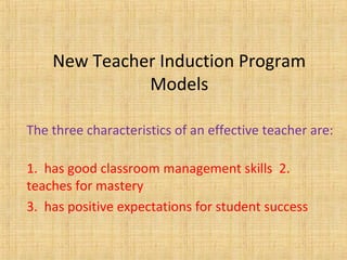 The document discusses new teacher induction program models. It describes the characteristics of effective teachers, including classroom management skills, teaching for mastery, and having positive expectations for students. It then outlines the components of a new teacher induction program, including assigning a program coordinator, developing teachers' skills through professional development, and establishing prerequisites for effective teaching.