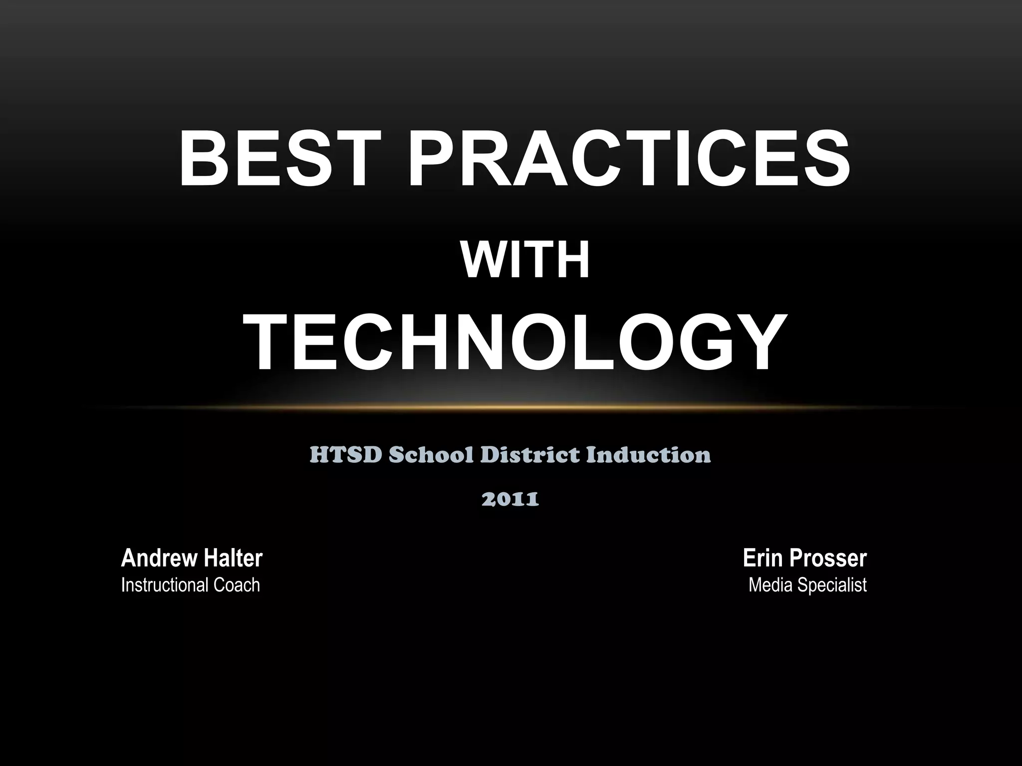 This document provides an overview of best practices for using technology in education based on a workshop for teachers. It discusses various digital tools for formative assessment, creating classroom resources, digital storytelling, and more. Tips are provided for integrating technology, including starting with one tool and sharing resources with colleagues. Teachers are encouraged to design a lesson using one of the tools or create a class wiki to start implementing these strategies.