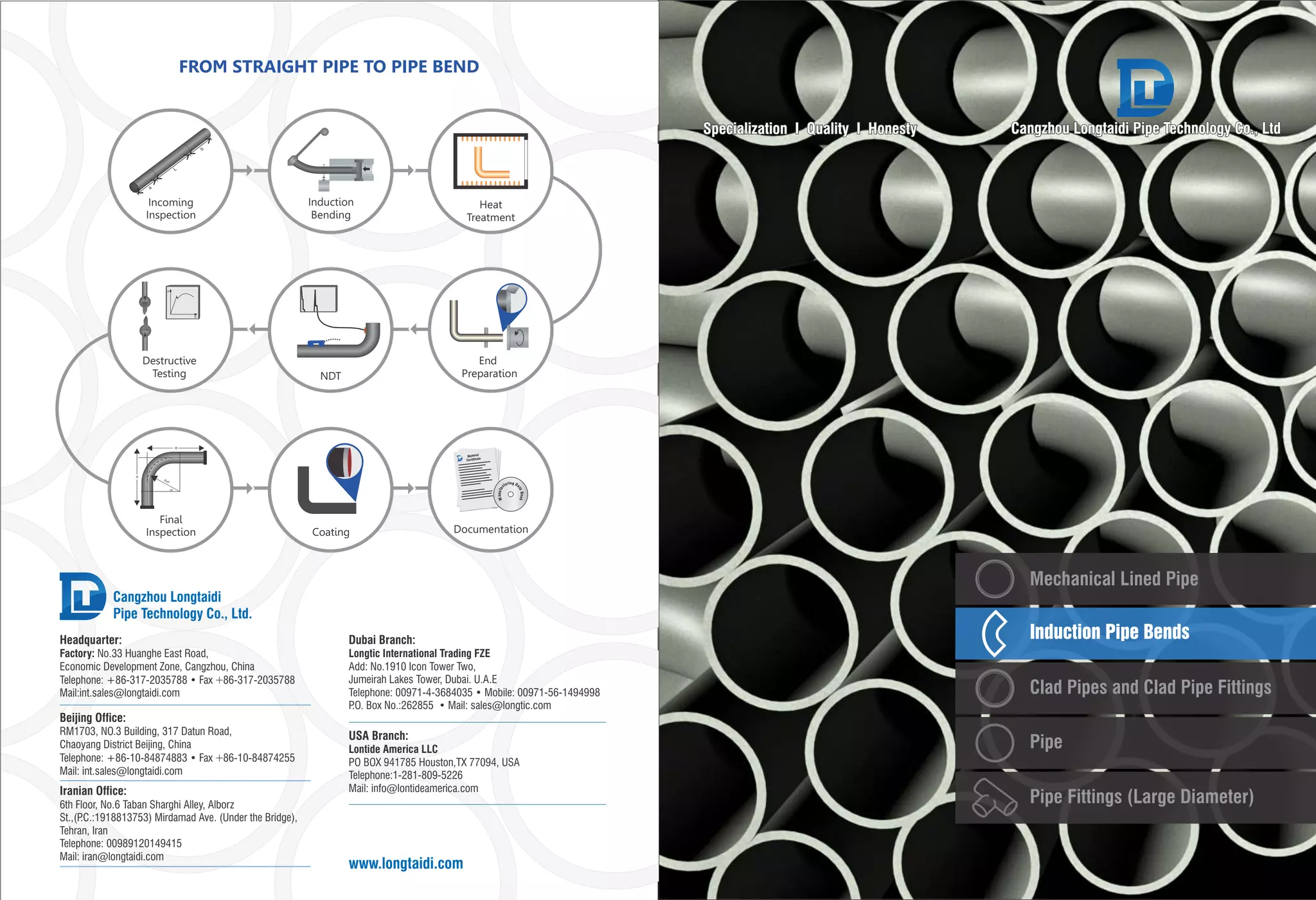 Longtaidi is a leading manufacturer of induction bends that uses induction bending technology to replace elbows and fittings. Induction bending involves applying controlled heat to pipe to form the desired shape. This provides benefits like eliminating welds, maintaining uniform wall thickness for strength, and often being less expensive than traditional components. Longtaidi has advanced equipment to closely control temperatures during forming for consistent quality. Materials bent include carbon steels, stainless steels, and corrosion-resistant alloys in sizes from 2 to 60 inches in diameter.