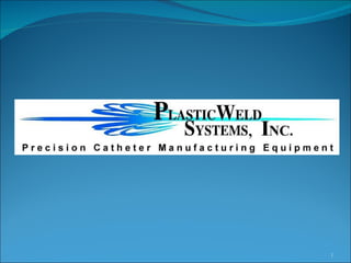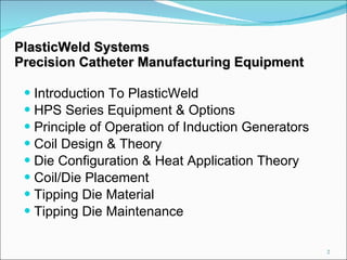The document discusses PlasticWeld Systems' HPS Series equipment for precision catheter manufacturing. It provides an overview of induction heating technology used in the equipment and describes the principle of operation of induction generators. It also covers topics like coil design and placement, die configuration, heating theory, and die maintenance.
