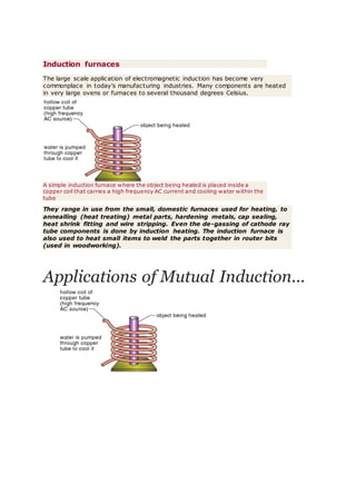 An induction furnace is an electrical furnace that uses induction heating to melt metals. It provides a clean and efficient melting process compared to other methods. Induction furnaces range in size from less than one kilogram capacity up to 100 tonnes, and are used to melt metals like iron, steel, copper and aluminum. Their advantages include precise temperature control and preventing loss of alloying elements during melting.