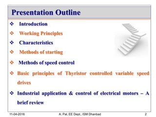 This document provides an overview of induction motors, including their working principles, characteristics, starting methods, speed control methods, and applications in variable speed drives. Some key points: