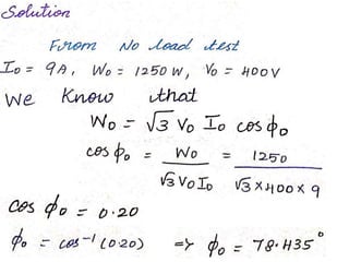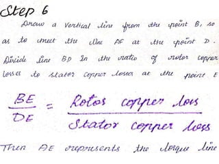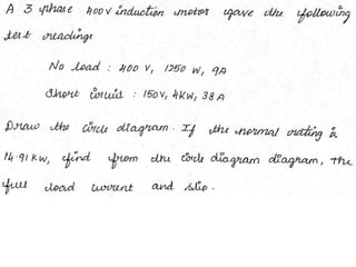 3) The construction and working of the circle diagram for analyzing induction motor performance using equivalent circuit parameters is explained.