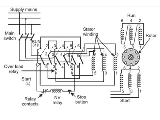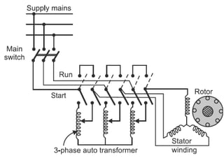 1) The document discusses various methods for starting and speed control of three-phase induction motors, including starters like stator resistance, rotor resistance, autotransformer, and star-delta starters.