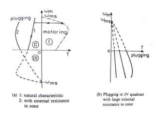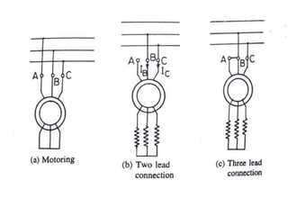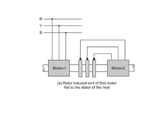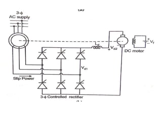 2) It also covers speed control methods like varying supply voltage, frequency, motor poles, and rotor resistance. Additionally, it describes the slip power recovery scheme.