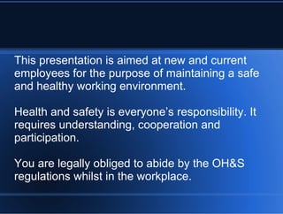 This presentation outlines the health and safety policies and procedures for employees. It discusses maintaining a safe work environment, identifying potential hazards, controlling risks, reporting incidents, emergency procedures, and the responsibilities of employers and employees. Key aspects covered include current safety procedures, equipment safety checks, health and safety representatives, common hazards, inspection processes, and emergency response plans. Resources for further information on occupational health and safety are also provided.