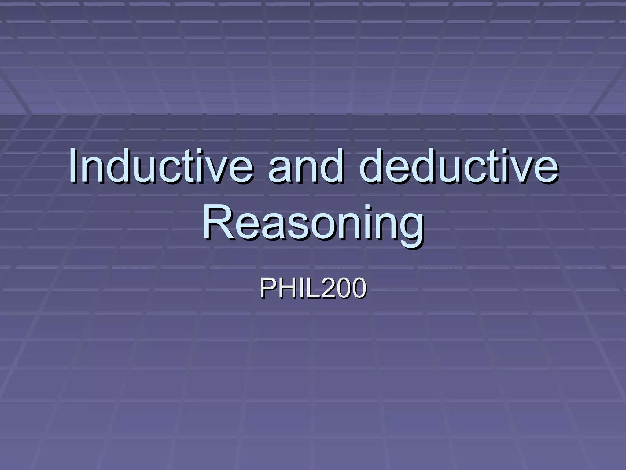 The document discusses inductive and deductive reasoning. It defines them as the two types of arguments: deductive arguments provide logically conclusive support to conclusions while inductive arguments provide probable support. Deductive arguments are based on laws and principles, using premises to logically derive a conclusion. Inductive arguments are based on experience and observation, using specific examples to generalize to broader conclusions. Examples of deductive arguments using major and minor premises are provided, along with discussions of constructing valid deductive arguments and indirect deductive methods like reductio ad absurdum. The differences between strong, weak, and cogent inductive arguments are also outlined.