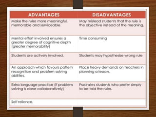 The document discusses the inductive teaching approach. It explains that with this approach, the teacher presents students with examples to help them induce and notice patterns and derive rules on their own. Students analyze examples to make comparisons and generalizations. This leads them to form rules with the teacher's guidance. They then practice applying the rules with more examples. This approach encourages active student participation and engagement in the learning process.