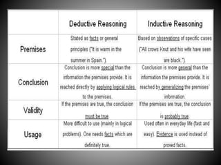 The document discusses several methods of inductive argumentation described by John Stuart Mill for drawing general conclusions from specific observations or facts. These include the method of agreement, method of difference, joint method of agreement and difference, method of residues, and method of concomitant variations. Examples are provided to illustrate each method and how they can be used to infer causal relationships between phenomena based on commonalities and differences observed across multiple instances.