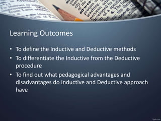 The document discusses the deductive and inductive methods of teaching. The deductive method is a teacher-centered approach where the teacher explains a new concept first before having students practice it. The inductive method uses student noticing by presenting examples for students to derive concepts from. Some advantages of deductive teaching are faster coverage of topics and no need for teachers to lead students to form generalizations. Inductive teaching engages students more and develops higher-order thinking as students analyze patterns themselves. The document also provides suggestions for how teachers can incorporate noticing in their lessons and considers factors to determine what method may work best for a given topic.