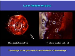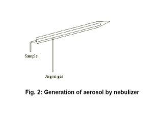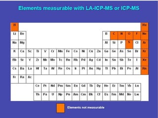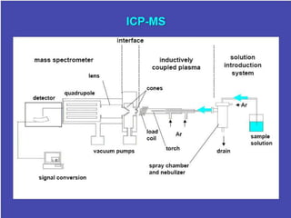 The document describes an inductively coupled plasma mass spectrometer (ICP-MS). ICP-MS works by ionizing a sample with inductively coupled plasma and then using a mass spectrometer to separate and quantify the ions. It can detect metals and some non-metals at very low concentrations. Compared to other techniques, ICP-MS has greater speed, precision, and sensitivity. However, it also introduces more interfering species than some other mass spectrometry methods. ICP-MS has a wide variety of applications including medical, environmental, forensic, and geochemical analysis.