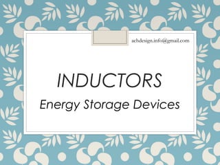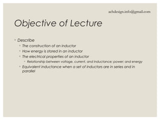 Inductors are energy storage devices that store energy in a magnetic field generated by an electric current and oppose changes in current flow. They can act like short circuits at steady state with DC sources, and their current must be continuous while voltage can be discontinuous. The document also details calculations for inductance in series and parallel configurations.