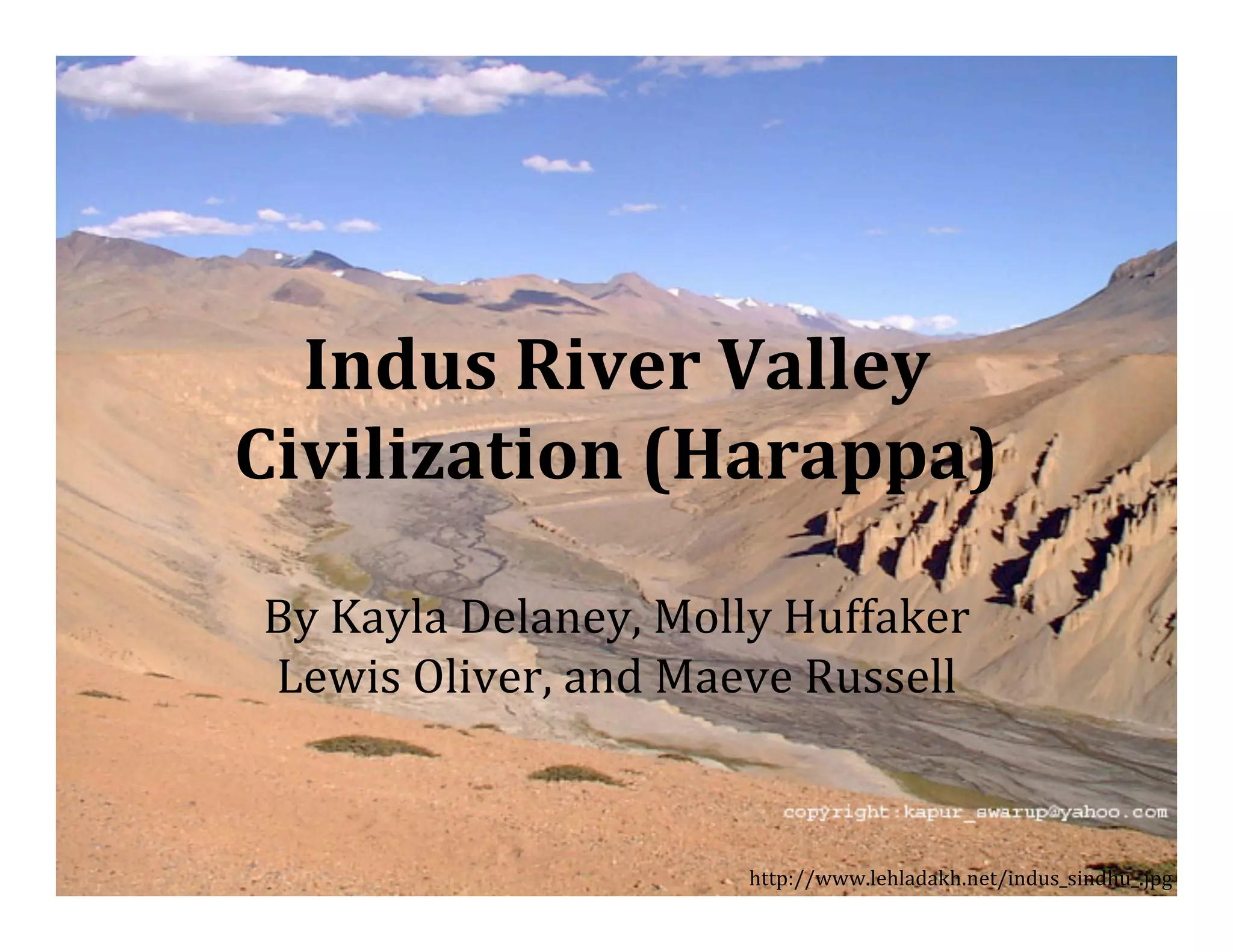 The Indus River Valley civilization arose around 6500 BCE in what is now Pakistan and northwestern India. Two major cities, Harappa and Mohenjo-Daro, were home to over 50,000 people each and featured advanced architecture including defensive walls, well-planned streets, and sophisticated water and drainage systems. The Indus people cultivated wheat, barley and cotton and engaged in extensive trade. Though the civilization declined between 2000-1800 BCE for unknown reasons, it was highly advanced for its time period.