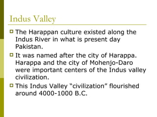 The Indus Valley civilization flourished between 4000-1000 BC along the Indus River valley in modern-day Pakistan. Major cities included Harappa and Mohenjo-Daro, which had impressive urban planning with organized streets and drainage systems. The civilization engaged in agriculture along the river and extensive trade. It declined around 1900-1300 BC due to various proposed factors such as flooding or drought.