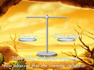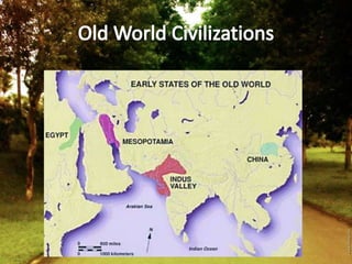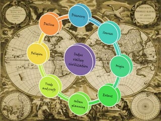 This document provides information about the Indus Valley Civilization, one of the earliest civilizations in South Asia. It flourished around 4000-1000 BCE along the Indus River valley. Key traits included the development of large urban settlements like Mohenjo-Daro and Harappa, advanced sanitation systems, and extensive trade networks connecting it to other regions. The civilization declined around 1900 BCE for currently unknown reasons, but its roots stretch back even earlier and influenced later cultures in the region.