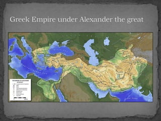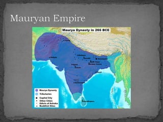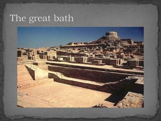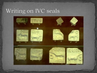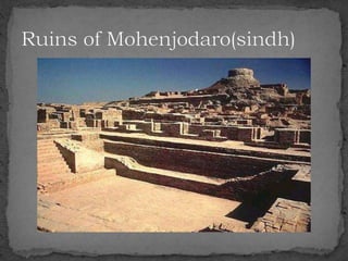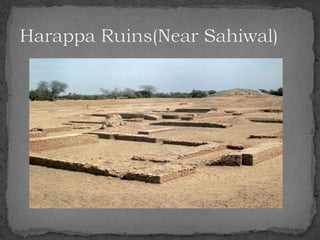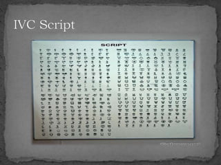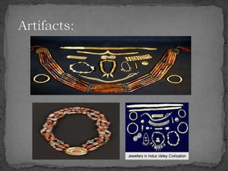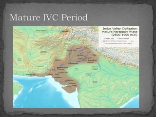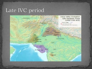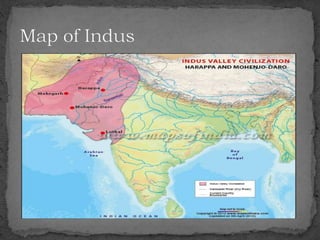 The document summarizes the Indus Valley Civilization, one of the three oldest civilizations in the ancient world. It discusses the geography and timeline of the civilization, revealing aspects of its urban planning, sanitation systems, arts, religion, and eventual decline around 1800 BCE. The causes of the decline are unknown but may have included drought or the arrival of the Aryans. Regional cultures emerged in the aftermath, blending with Vedic traditions, and the region later came under the control of successive empires until the arrival of Islam in 712 CE.
