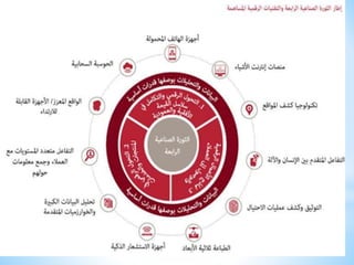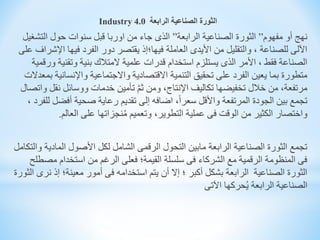 تتناول الوثيقة الثورة الصناعية الرابعة والتي تمثل تحولًا رقميًا شاملًا يهدف إلى دمج التكنولوجيا الحديثة في العمليات الصناعية. تهدف هذه الثورة إلى تحسين التواصل، وزيادة الإنتاجية، وتطوير نماذج أعمال جديدة، مع التركيز على التحديات والفرص التي تقدمها. يتعين على الدول النامية الاستعداد لاستغلال الفرص المتاحة بينما تواجه تحديات تتعلق بالتكنولوجيا والموارد البشرية والبيئة التنافسية.