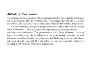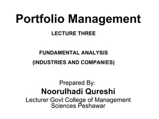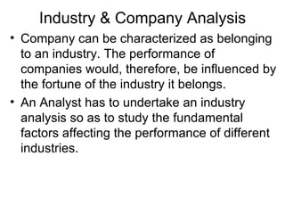 This document discusses fundamental analysis in portfolio management, focusing on industry and company analysis as crucial for assessing investment opportunities. It outlines the product life cycle, which comprises four stages: introduction, growth, maturity, and decline, detailing the characteristics and implications of each stage. Additionally, it describes the industry life cycle concept, identifying stages from pioneering to decay, and highlights the importance of understanding cost structures in industry analysis.