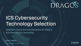 The document outlines criteria and considerations for selecting cybersecurity technology for Industrial Control Systems (ICS), emphasizing the need for threat detection and incident response capabilities. It discusses the importance of evaluating technology alongside existing systems and aligning requirements with organizational goals, while highlighting various technologies for asset discovery and threat management. Recommendations include establishing clear evaluation criteria and the significance of independent testing to assess solutions effectively.