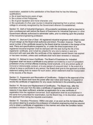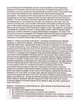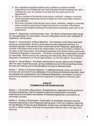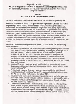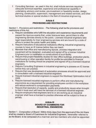 The document is a letter requesting support from various government officials and organizations for a proposed Industrial Engineering Law in the Philippines. The letter outlines several benefits that would come from passing this law, including regulating the practice of industrial engineering, enhancing the profession nationally and internationally, and requiring industrial engineers to have licenses to ensure safety, quality, and ethics standards are met. The letter asks recipients to support passing this proposed legislation to similarly license and regulate industrial engineers as other engineering professions in the Philippines.