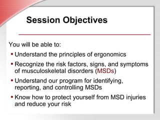 This document discusses ergonomics and musculoskeletal disorders (MSDs) in an industrial setting. It defines ergonomics as modifying jobs to fit people's capabilities in order to reduce MSDs caused by repetitive motions, forceful exertions, awkward postures, contact stress, and vibrations. It outlines general signs and symptoms of MSDs, common MSD types, and risk factors that can lead to MSDs like repetitive motions, forceful exertions, awkward postures, contact stress, and vibrations. The document recommends identifying and controlling MSD hazards through engineering controls, work practice changes, administrative controls, and personal protective equipment as part of an ergonomics management program.