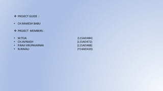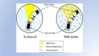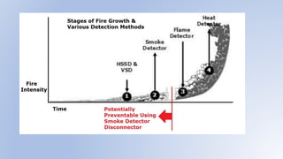 This document summarizes a student project to design and construct a fire alarm system and smoke detector using a SCADA system. The project has four members and aims to study fire alarm and smoke detecting systems, discover fires early through detection devices, and control fires. It discusses causes of fires, fire stages, sensor types, and advantages like reducing manpower needs, costs, and losses. Applications mentioned include uses in transportation, industries, residential and commercial areas.