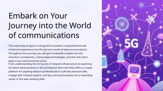 The document outlines an industrial internship in telecommunications led by Sarpavarapu Bharat, focusing on providing participants with immersive insights into the industry, from network infrastructure to cutting-edge technologies like 5G. It covers the global and local impact of telecommunications, technological advancements, essential network components, and skills gained throughout the internship. Additionally, it discusses the role of telecom in various industries and the importance of compliance and security measures.