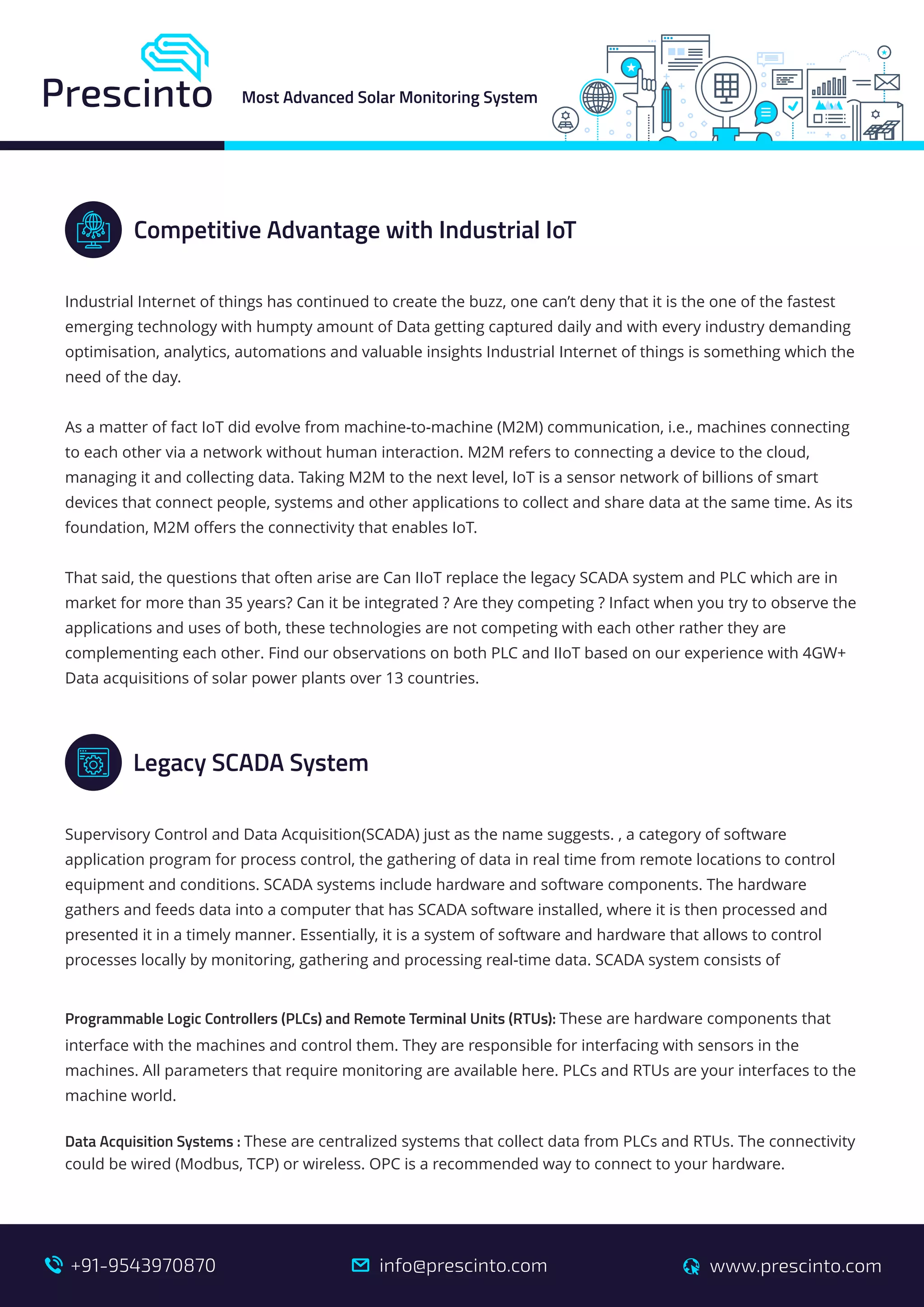 The document describes the integration of Industrial Internet of Things (IIoT) with Supervisory Control and Data Acquisition (SCADA) systems in solar power monitoring, emphasizing their complementary roles in optimizing operations and enhancing data analytics. It highlights Prescinto's IIoT platform, which offers real-time monitoring, advanced analytics, and automation services to improve efficiency in solar power plants across 13 countries. By leveraging the capabilities of IIoT, Prescinto aims to enhance performance benchmarking, and predictive maintenance, positioning itself as a leading solution in the renewable energy sector.