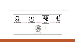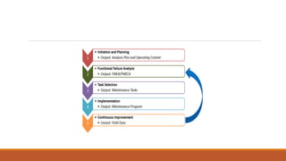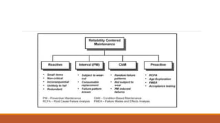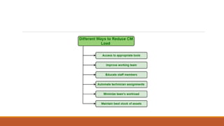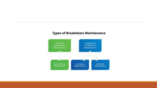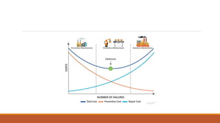 The document elaborates on industrial maintenance, defining it as the practice of ensuring equipment and machines are functional to produce quality products while managing costs. It outlines various types of maintenance, including corrective, preventive, predictive, and reliability-centered maintenance, each with its advantages and disadvantages. Concepts of reliability, breakdown maintenance, and strategies for improving maintenance efficiency are also discussed.