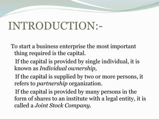 This document discusses different types of business ownership structures including single ownership, partnership, joint stock companies, cooperative organizations, and public and private sectors. It provides details on the key characteristics of each type as well as their advantages and disadvantages. The main types of ownership structures covered are single ownership, general partnership, limited partnership, private limited companies, public limited companies, cooperative organizations, public sector enterprises, and private sector businesses.