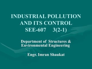 The document addresses industrial pollution and its control, focusing on industrial effluents, types and sources, water treatment techniques, and management of hazardous waste. It elaborates on various pollution types such as air, water, soil, and noise pollution while detailing wastewater characteristics and treatment options across different industries. The text also outlines practical applications and learning outcomes related to the assessment and management of industrial waste.