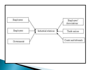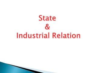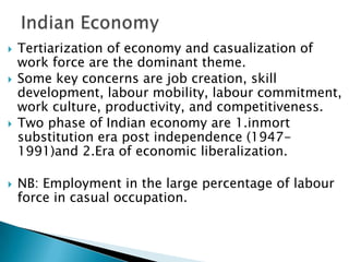 The document discusses several key aspects of India's labor market and industrial relations system. It notes that the Indian economy has transitioned from import substitution post-independence to economic liberalization. The labor force is predominantly casual and informal, with only 13% in regular wage employment. There are concerns around job creation, skills, mobility, productivity and competitiveness. Industrial relations involve multiple parties like workers, management, unions and the government and are influenced by economic, social, political and technological factors. The state plays a role in regulating labor issues through various laws and policies.