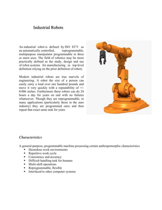 This document provides an overview of industrial robots, detailing their operation, types, and applications in modern industries. It defines industrial robots as programmable manipulators used for tasks such as welding and material handling, with advantages including increased quality and efficiency, but also noting disadvantages like job loss and high costs. The document further outlines five popular applications of industrial robots, including handling operations and welding.