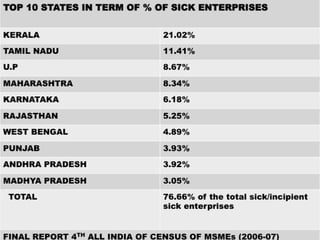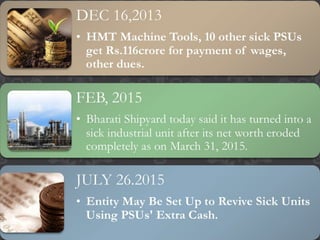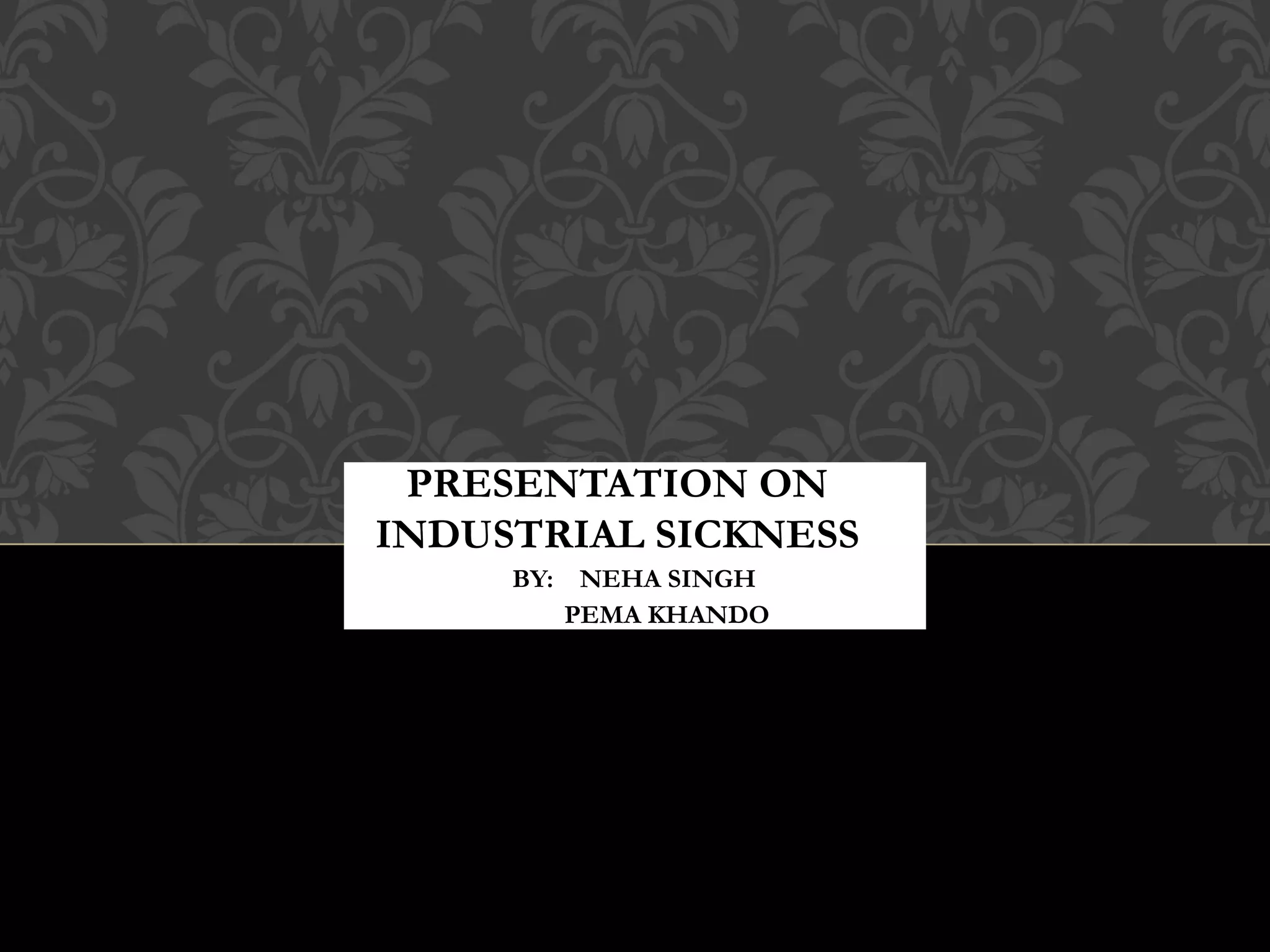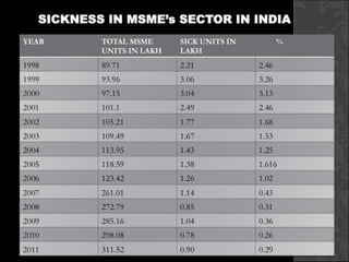 Industrial sickness in India has been increasing, affecting both traditional and modern industries, with over 200,000 sick units and an outstanding bank credit of over Rs. 7,000 crores. Causes include both internal and external factors such as financial problems, technological flaws, and government policies. Prevention and recovery measures suggested include proper project planning, market analysis, and government support through soft loans and liberalization strategies.