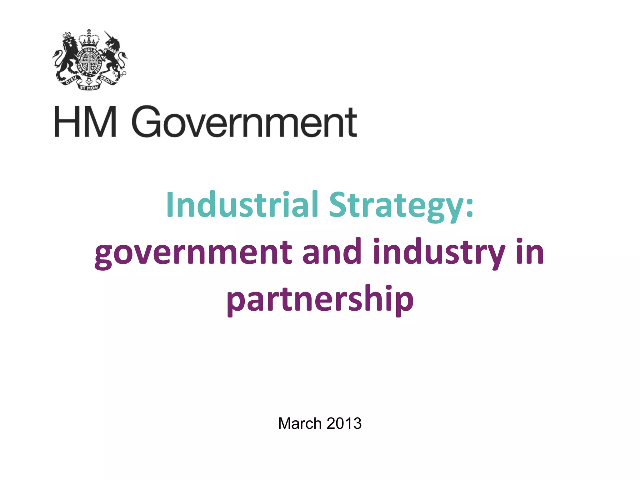 The document outlines the UK government's industrial strategy to promote partnership between government and industry. It discusses the need for the strategy due to changes in the global economy and the UK's relative position. The strategy focuses on strategic partnerships in key sectors like aerospace, offshore wind, and construction. Progress to date includes commitments in life sciences, automotive investments, technology investments, improving access to finance, procurement, and skills. The overall goal is to promote long term growth through these partnerships and investments.