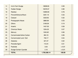 Industrial waste includes waste produced by factories, mills, and mines that can be hazardous or non-hazardous. It is categorized as liquid waste, sludge, solid waste, or hazardous waste. In Malaysia, industrial waste has evolved over time with the country's major industries - starting with chemical, textile, and metal working in the 1970s, expanding to include food/beverages, furniture, and plastics in the 1980s, and now focusing on electronics, engineering, and telecommunications. The amount of industrial waste generated is directly related to the level of industrial production.
