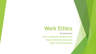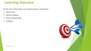The document discusses various topics related to work ethics including policies and procedures, adherence to employer policies, decision making, integrity, self-confidence, and relationships in the workplace. It provides guidance on developing and following clear policies, treating employees and peers with respect, maintaining honest and professional relationships with clients, and demonstrating integrity through one's actions.